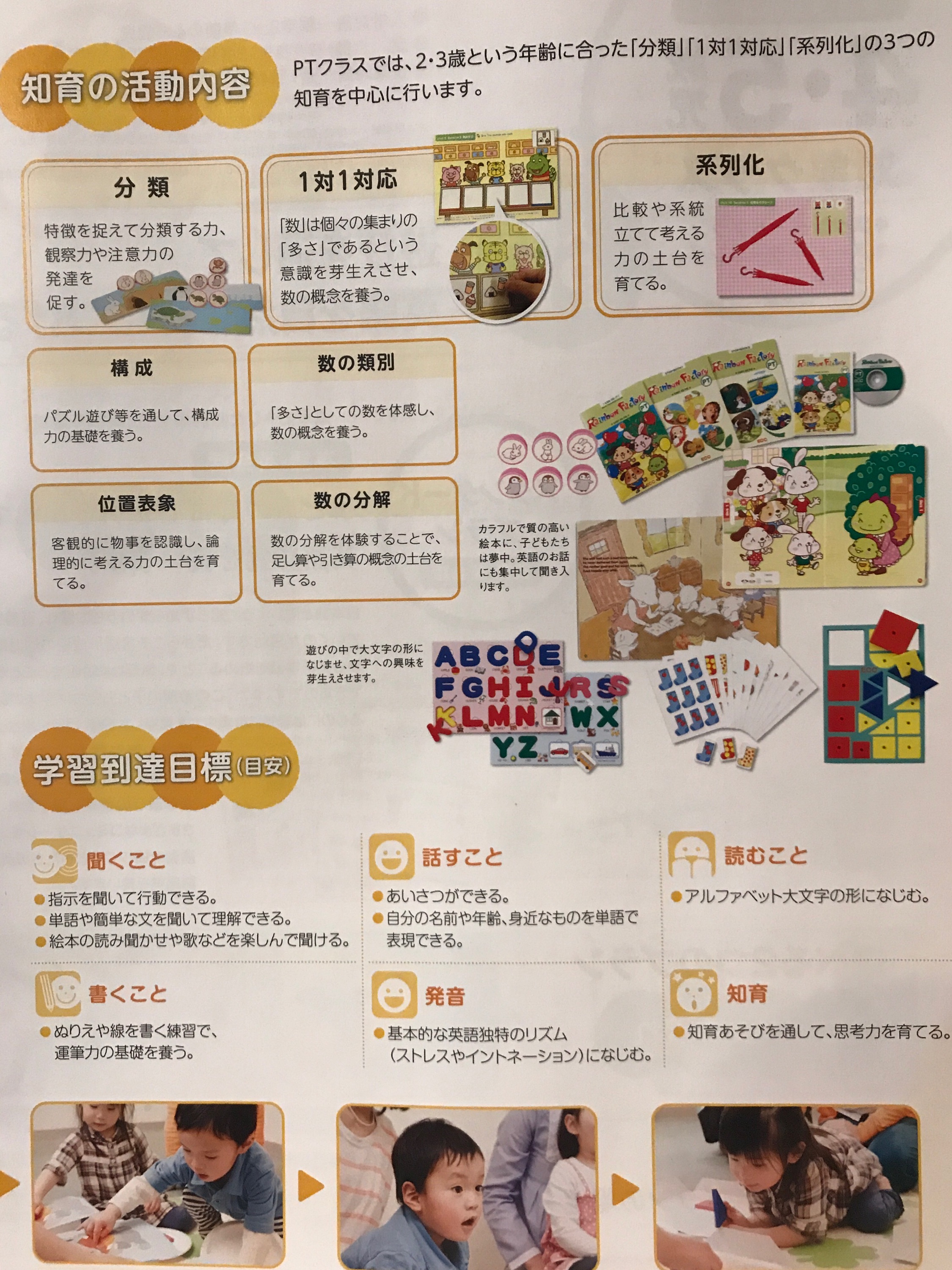 3歳児クラスは「知育遊び』が中心です。「知育」とは、幼児の知的発達を促進し、知識を高める 教育のこと。子供たちが大好きな知育遊びを英語で行いながら、心と知識を育み自然に英語を 身につけます。
